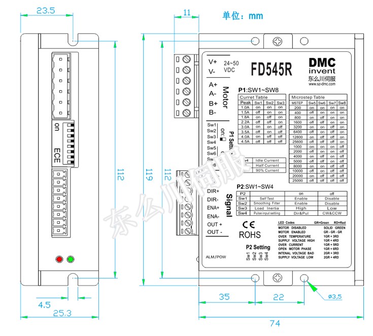 FD545R產品是東么川公司采用先進的DSP控制芯片與獨特的控制電路結合一起所構成的新一代智能數字式細分型步進電機驅動器,基于精密的PID電流控制算法設計,高速大力矩輸出,靜止時動態(tài)電流自動減半,使電機溫度大為降低,最大限度發(fā)揮電機的性能,用戶可以設置1-128細分.低,中,高速運行都非常平穩(wěn),幾乎沒有振動和噪音,完全解決了步進電機低速振動,和噪音的曲線,驅動器內部集成了參數自動調整功能,能夠針對不同參數電機自動生成最優(yōu)的運行參數。
