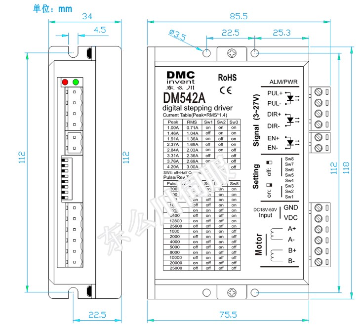 簡介:DM545A型驅動器,具有更低的電機發熱、運行噪聲和更高的平穩性,以及更低的成本,主要驅動42、57型兩相混合式步進電機。其微步細分數有15種,最大步數為25000Pulse/rev;其工作峰值電流范圍為1A-4.2A,輸出電流共有8檔,電流的分辨率約為0.45A;具有自動半流,過壓和過流保護等功能。本驅動器為直流供電,建議工作電壓范圍為24VDC-36VDC,電壓不超過50VDC,不低于20VDC